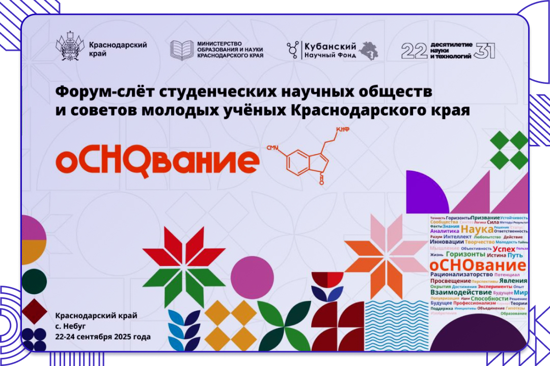 22-24 сентября 2025 года в живописном поселке Небуг Туапсинского района состоится ежегодный форум-слёт «оСНОвание» для студенческих научных обществ и советов молодых учёных Краснодарского края.